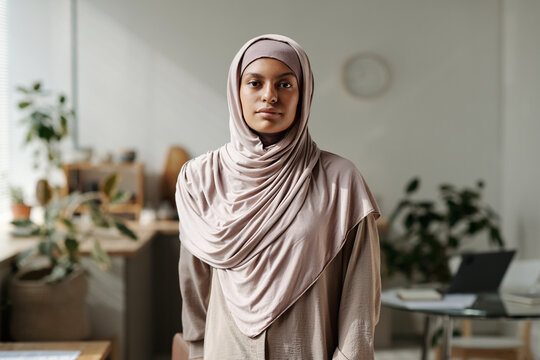Young beautiful Muslim woman in beige headscarf and pullover looking at camera while standing in the kitchen against workplace and counter
