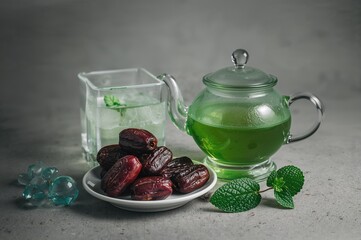 Fresh dates with a teapot and green tea setup, perfect for Ramadan and healthy nutrition