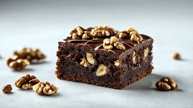Decadent walnut brownie square with chocolate ganache and scattered nuts