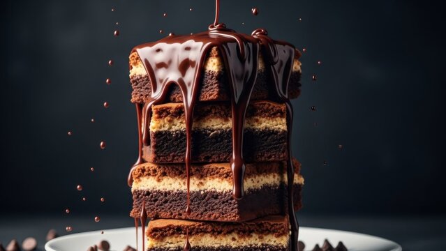 Chocolate brownie pieces stacked and covered with hot chocolate sauce on dark brown background. Brownie squares are stacked. Melted chocolate flows down. Dessert food photography for advertising.