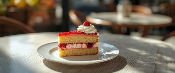 Sponge cake jam dessert slice sweet icing sugar homemade bakery snack crumb texture golden crust strawberry red topping vanilla moist soft square fluffy closeup gourmet treat indulgent baked