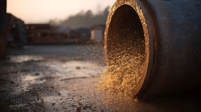 A concrete pipe discharges a stream of water and sediment creating a splash in the soft light of dawn at an industrial site