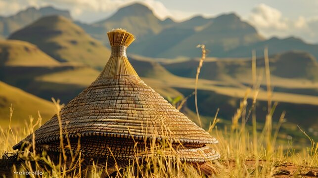 The traditional Basotho grass-works made hat, called "mokorotlo". It is a symbol of Lesotho's unification. African souvenirs. Southern Africa.