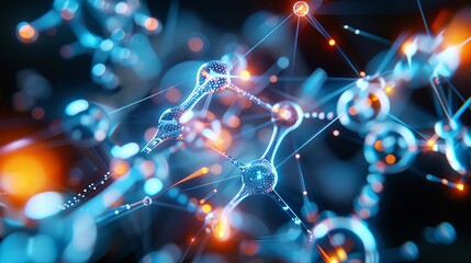 Captivating close-up of molecular structure showcasing intricate connections and glowing particles in a futuristic blue tone.