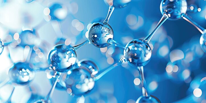 Digital illustration of a blue molecular structure on a dark background with bokeh effects