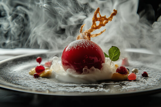 Chef's table presentation of molecular gastronomy desserts.A close up of a beautifully arranged plate of food with rising smoke