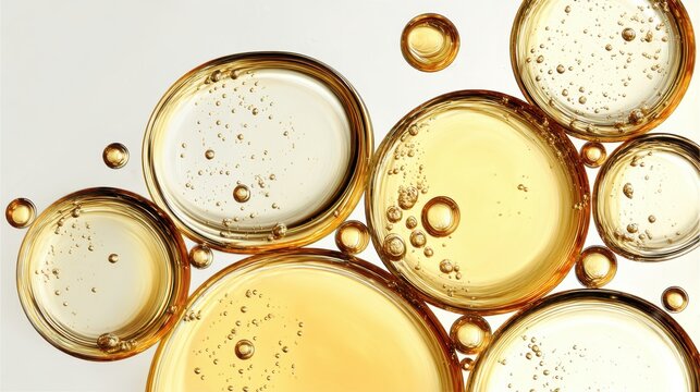 Luminous collagen serum bubbles forming dynamic skincare background, blending scientific precision with luxurious golden sheen and intricate bubble layering
