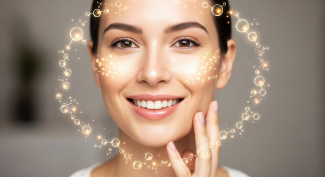 Happy young woman with radiant face for beauty and cosmetic concept. molecule circle creates skincare glow on her perfect skin, showing new anti aging treatment