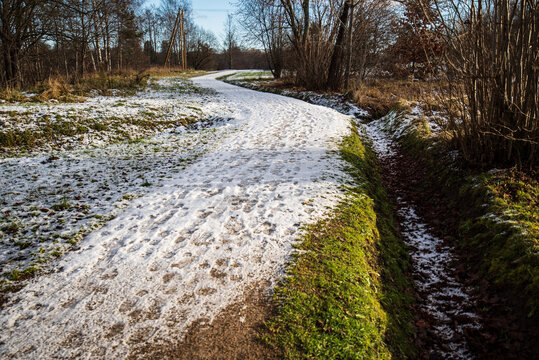 A winding walking trail with the first snow and footprints on sunny autumn day. Kuldiga, Latvia
