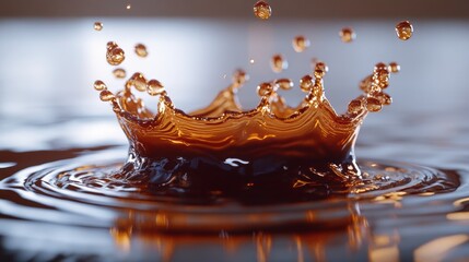 A cascading crown of molten liquid chocolate, shimmering with a thousand reflections, splashed into a crystal-clear pool, leaving a mesmerizing trail of ripples in its wake.
