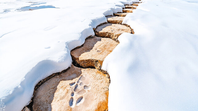 Snowy stepping stone path with paw print, winter walkway background