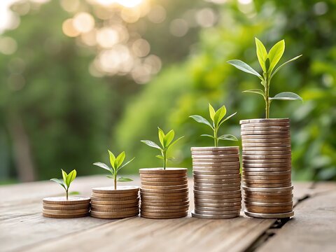 Growing plants on stacks of coins symbolizing financial growth and investment