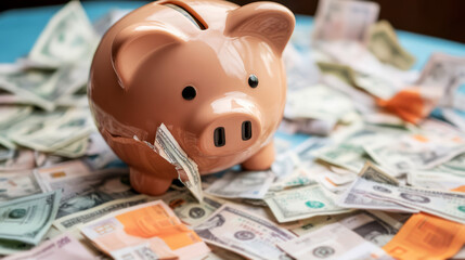 Broken Piggy Bank Overflowing With Us Dollar Bills.  Financial Crisis, Bankruptcy, Debt Concept.