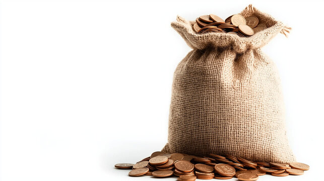 A simple burlap bag filled with coins, evoking the themes of wealth accumulation, savings, and economic success.