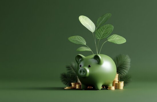 Green piggy bank with a plant sprouting from its head, symbolizing growth, savings, and financial prosperity
