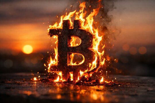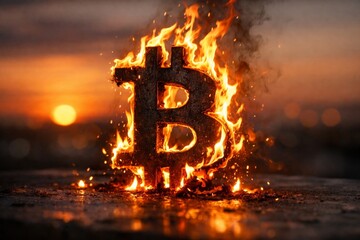 Dynamic bitcoin symbol on fire during sunset. Vibrant colors create intense atmosphere. This striking image captures cryptocurrency's power and appeal. Perfect for financial themes.