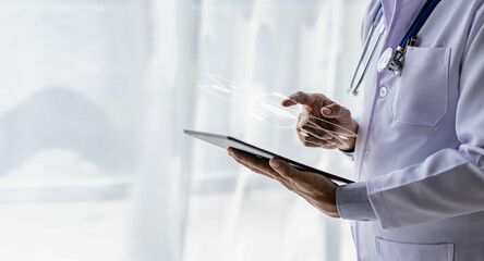 Young asian male doctor in white coat holding tablet with medical health concept icons