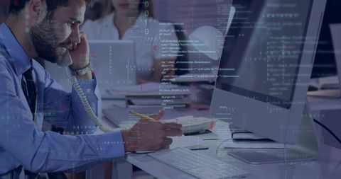 Businessman holding phone and writing notes while monitoring code on desktop computer