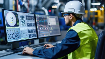 An industrial machinery engineer monitoring AI generative dashboard showing predictive analytics and real-time business data