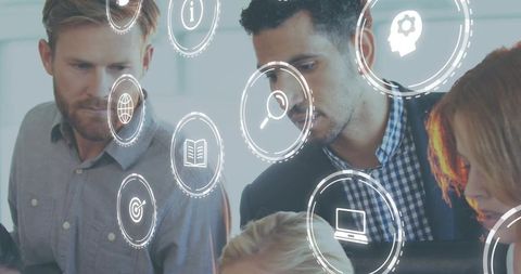 Team collaborating around monitor using augmented reality dashboard for business decisions