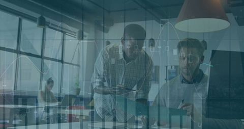 Team reviewing analytics dashboard, pointing at monitor in modern open-plan office