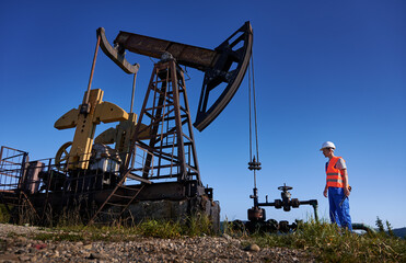 Engineer wearing safety helmet and insulated vest inspects electric grid field using tablet near gas insulated switchgear gis equipment in industrial setting