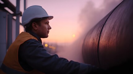 Engineer inspecting desalination plant control panel, monitoring gauges, large seawater intake pipes visible