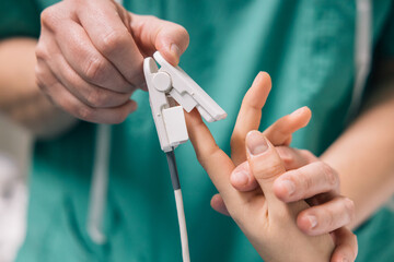 Pediatrician examining child while father holding arm with bp cuff and vital monitor