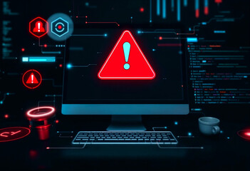 Cybersecurity alert with flashing scam warning on computer screen in office environment