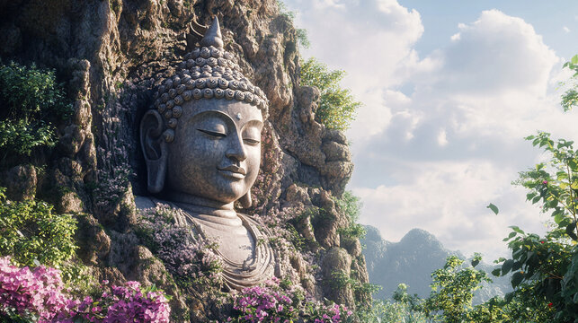 A monk meditates in front of the Buddha statue, with misty mountains and green forests behind him. The huge Buddha sits on top of a rock wall. Generative AI.