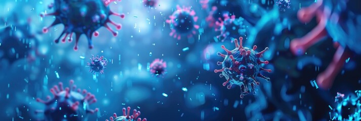 Coronavirus Header. Panoramic Banner with Blue-lit Viruses. 3D Rendering of SARS-CoV-2 Inside Organism
