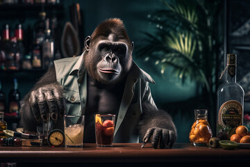 Chipanzee in a brown corduroy jacket drinks a glass of beer in a bar Pub, banner, poster