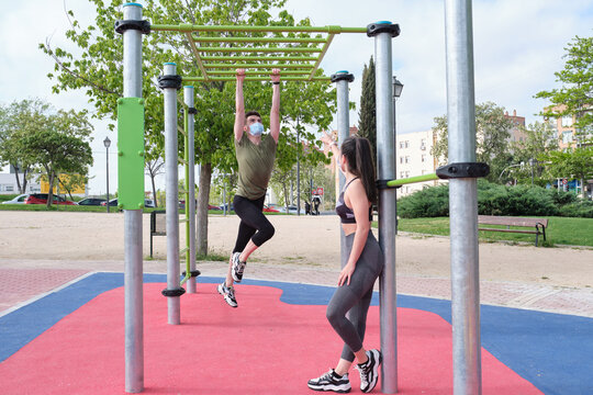 Crossfit fitness man exercising chin-ups workout. Young male adult trainer athlete portrait closeup with hands holding on monkey bars at outdoor gym doing a chin-up strength training muscle exercise.