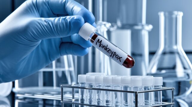 A gloved hand holding a test tube labeled "MONKEY POX." In the background is an immaculately clean laboratory environment with glass containers and a metal shelf.