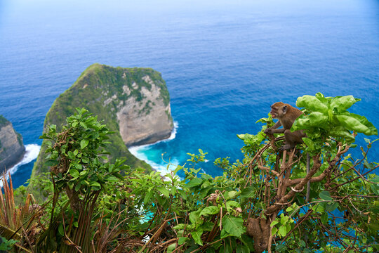 A monkey sits on a tree with a view of the ocean and a cliff on the island of Nusa Penida.