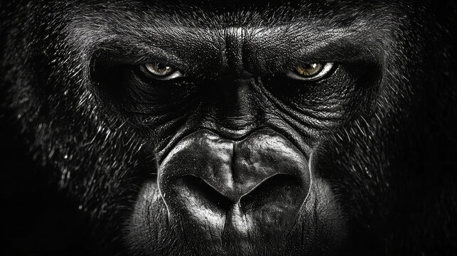 Portrait face powerful dominant male gorilla on black background, Beautiful Portrait of a Gorilla. severe silverback, anthropoid ape, stern face. isolated black background