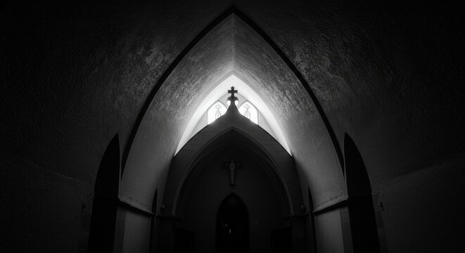 Dramatic monochrome interior view of church architecture with cross