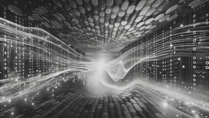 Monochrome cityscape merged with digital code and binary numbers, implying the rise of tech-driven industries"