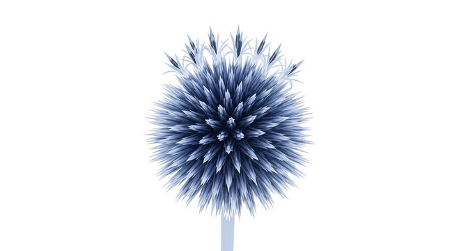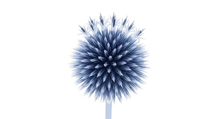 A single blue globe thistle flower head with spiky petals isolated on a clean white background.