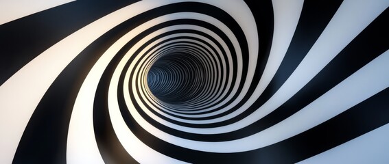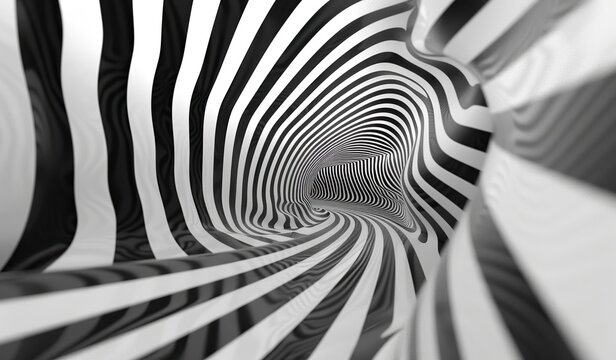 Optical illusion of a spiral tunnel created with black and white stripes enhancing depth perception in a highly detailed 3D rendering