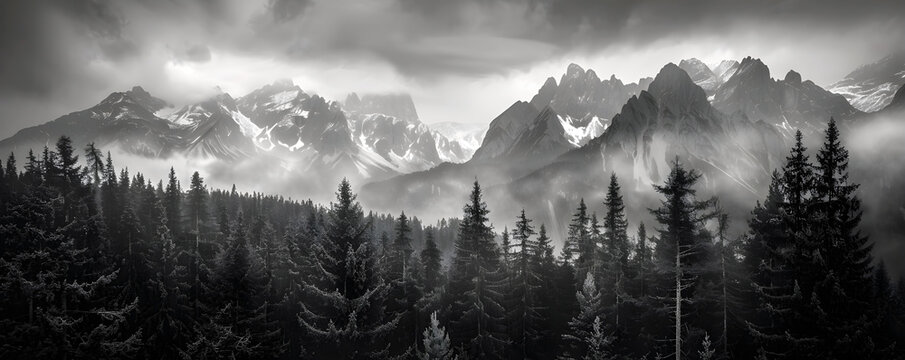 Professional monochrome panorama of coniferous forest and snowy mountain range in clouds. Graphic black and white poster of wild landscape. Photo shot for interior painting.
