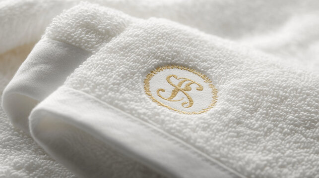 Close-up of white cotton towel set with gold monogram embroidered in corner, fine stitching detail under soft daylight