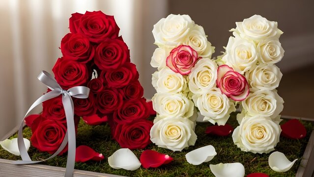 Beautifully crafted monogram arrangement featuring a striking red letter a and a white letter m with subtle pink accents representing romantic gestures