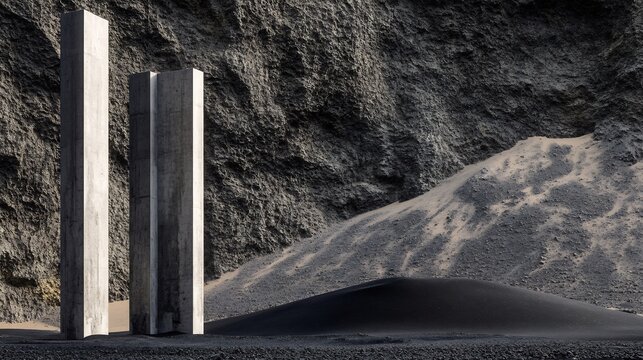 Mysterious Pillars in Storm: A dramatic scene unfolds as weathered stone pillars stand defiantly amidst a tumultuous sea under a stormy sky. Reflecting the power of nature and ancient mystery.