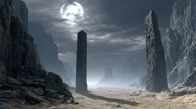 Two tall, weathered stone pillars stand sentinel in a misty, dark coastal landscape