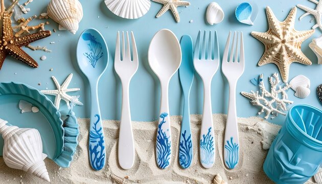 Blue and White Recycled Plastic Cutlery on Sand with Seashells and Starfish