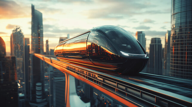 A futuristic monorail gliding above a city skyline.