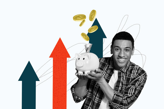 Poster sketch image artwork 3D photo collage of arrow up young man smile success hand hold pig save money rich wealth bank salary income