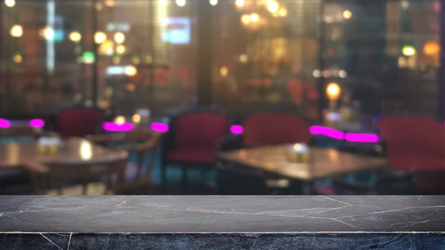 Empty black mable stone table top on abstract blurred restaurant and nightclub lights background - can be used for display or montage your products