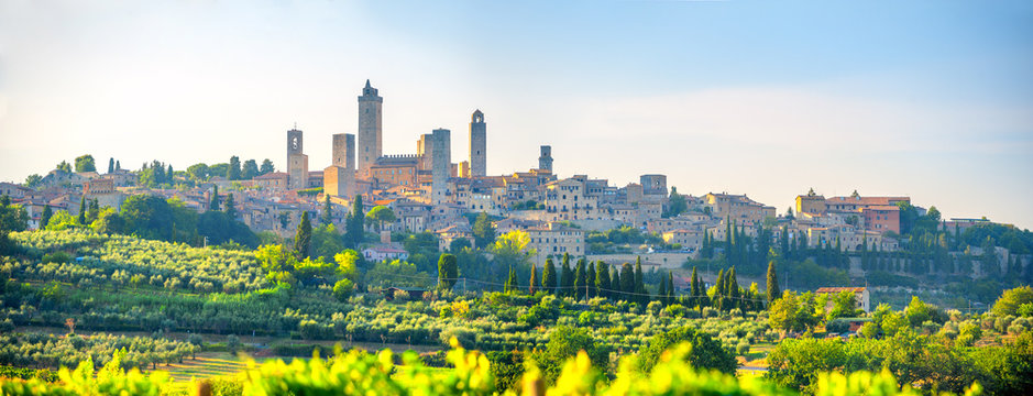 Panorama of the beautiful ancient city of San Gimmignano at sunset, Tuscany, Italy. Europe
